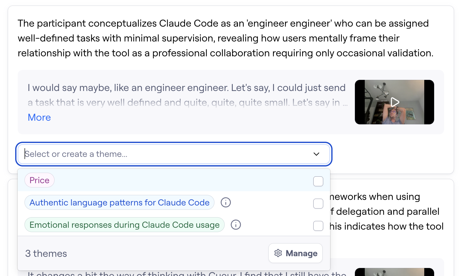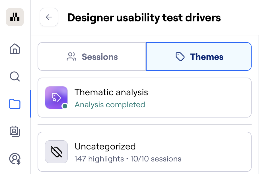 After reviewing your sessions, you can move to the Themes tab to organize and analyze your insights.