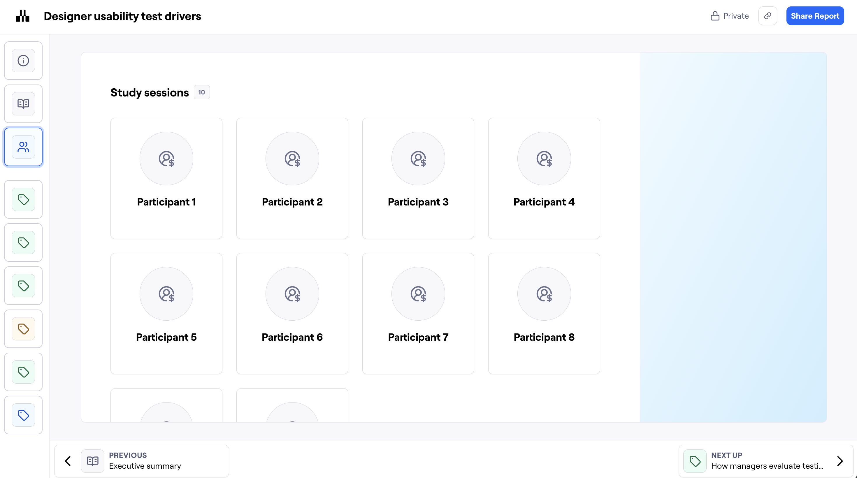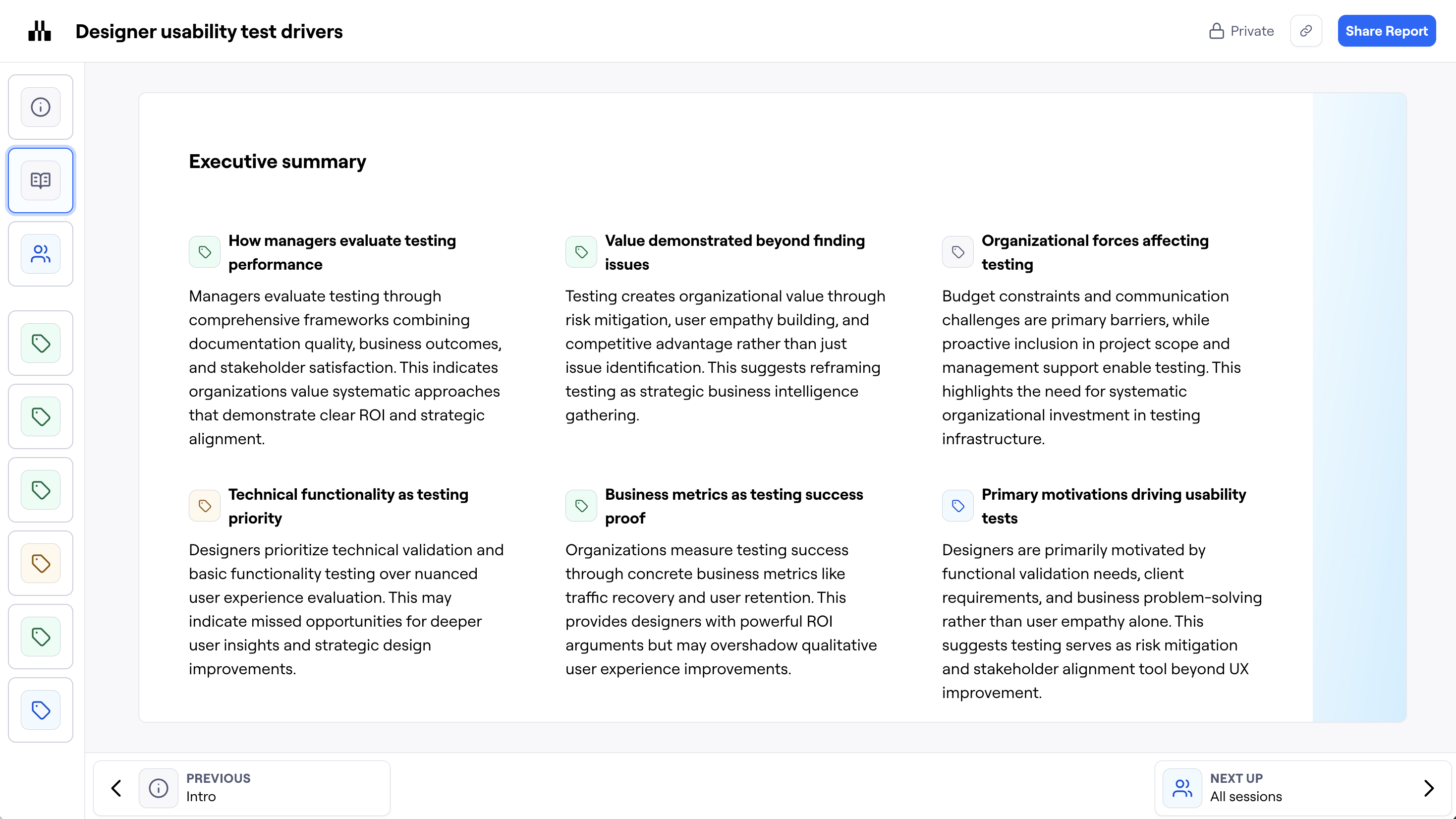 The study report is a presentation that provides an executive summary, overview of each theme and its associated highlights, as well as an overview of each session. Reports make it easy to share and present your findings.