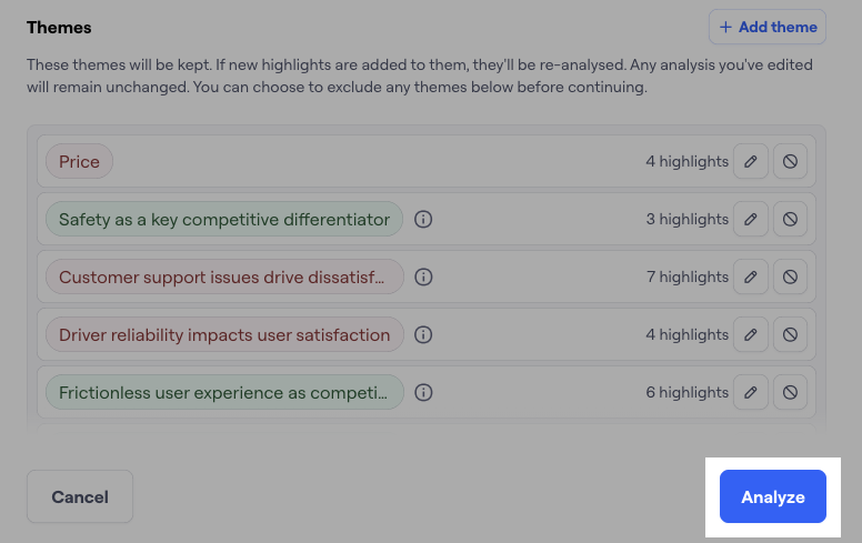 We'll default to Keep current themes and give you the opportunity to add, edit or exclude the existing ones. Much like the initial analysis, AI may still find and create new themes while taking the existing themes into account. Alternatively, you can use Start from scratch with AI if you don't want any manually added or existing themes to be considered.