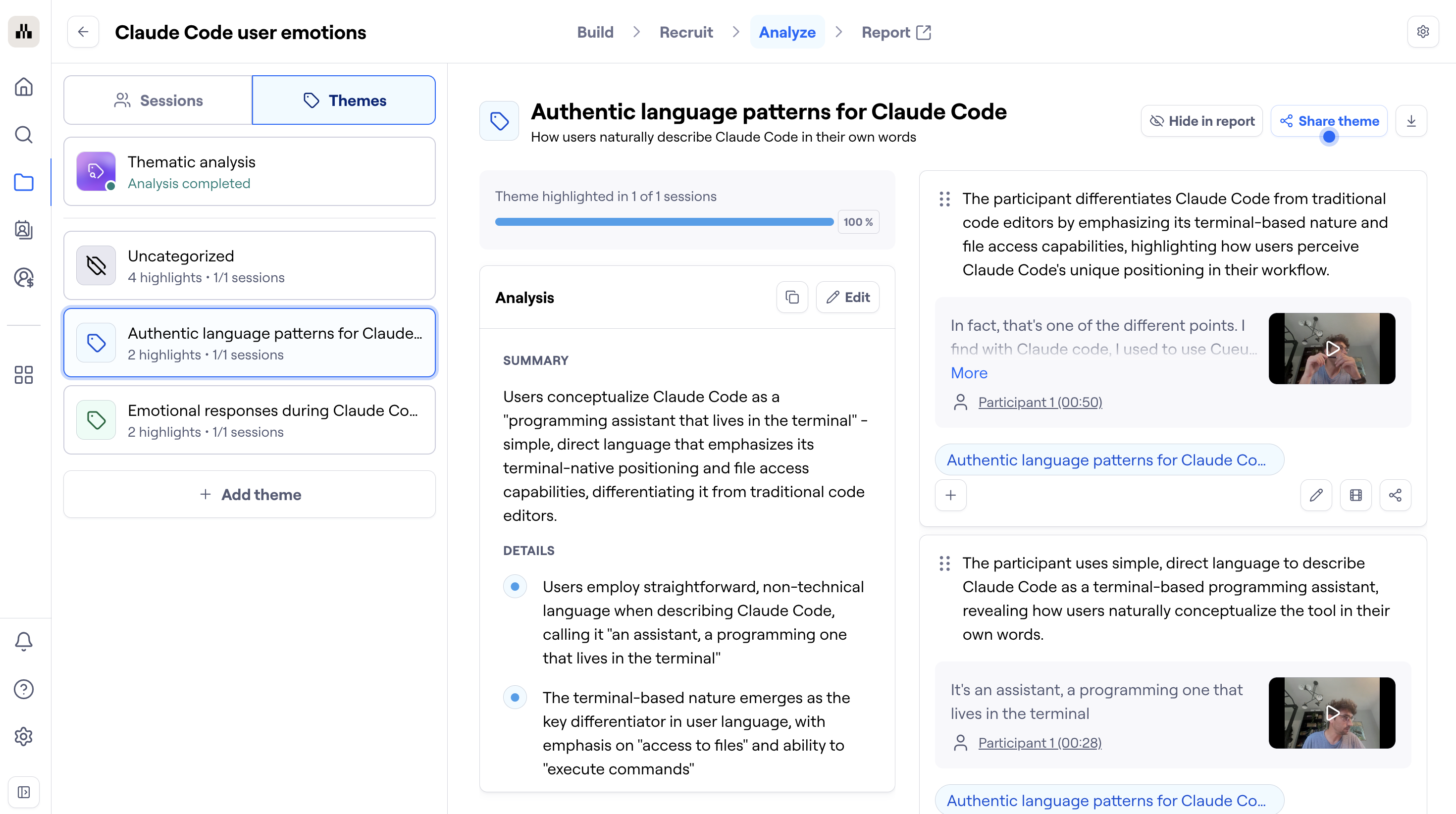 Click on any theme to dive into detailed analysis results including an AI-generated summary, key findings, and video highlights with embedded transcripts and timestamps. You'll also see how many sessions contributed to each theme, giving you a clear sense of how prevalent each topic was across your participant pool.