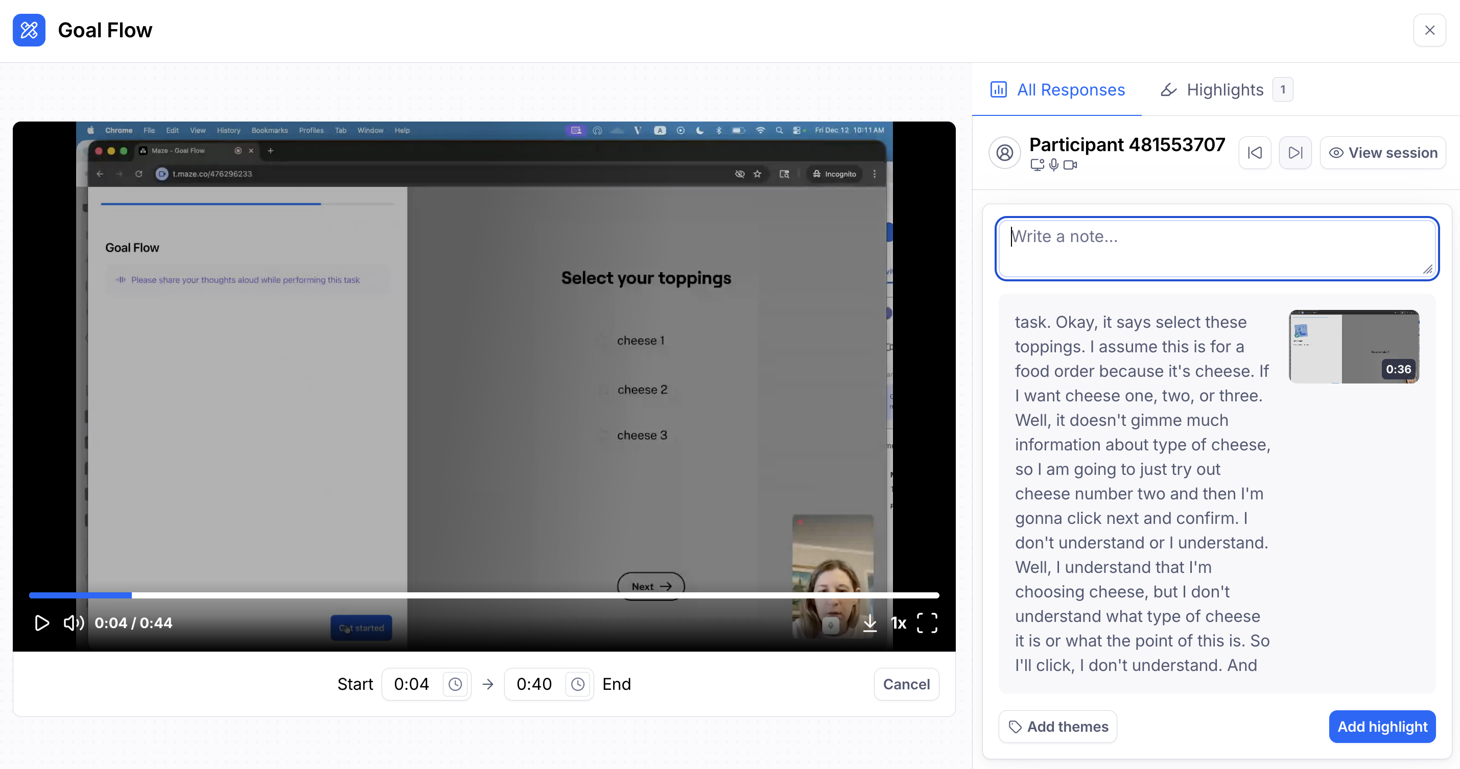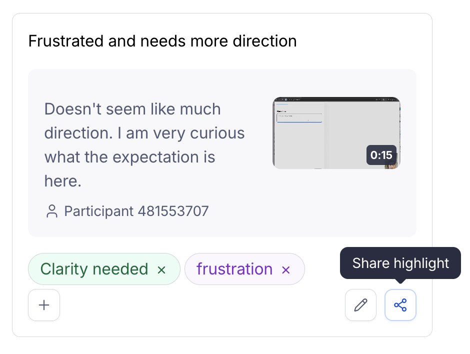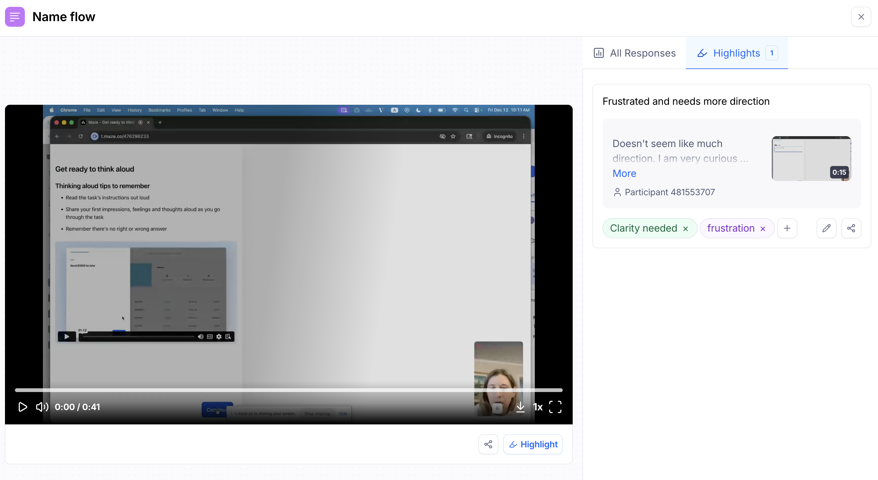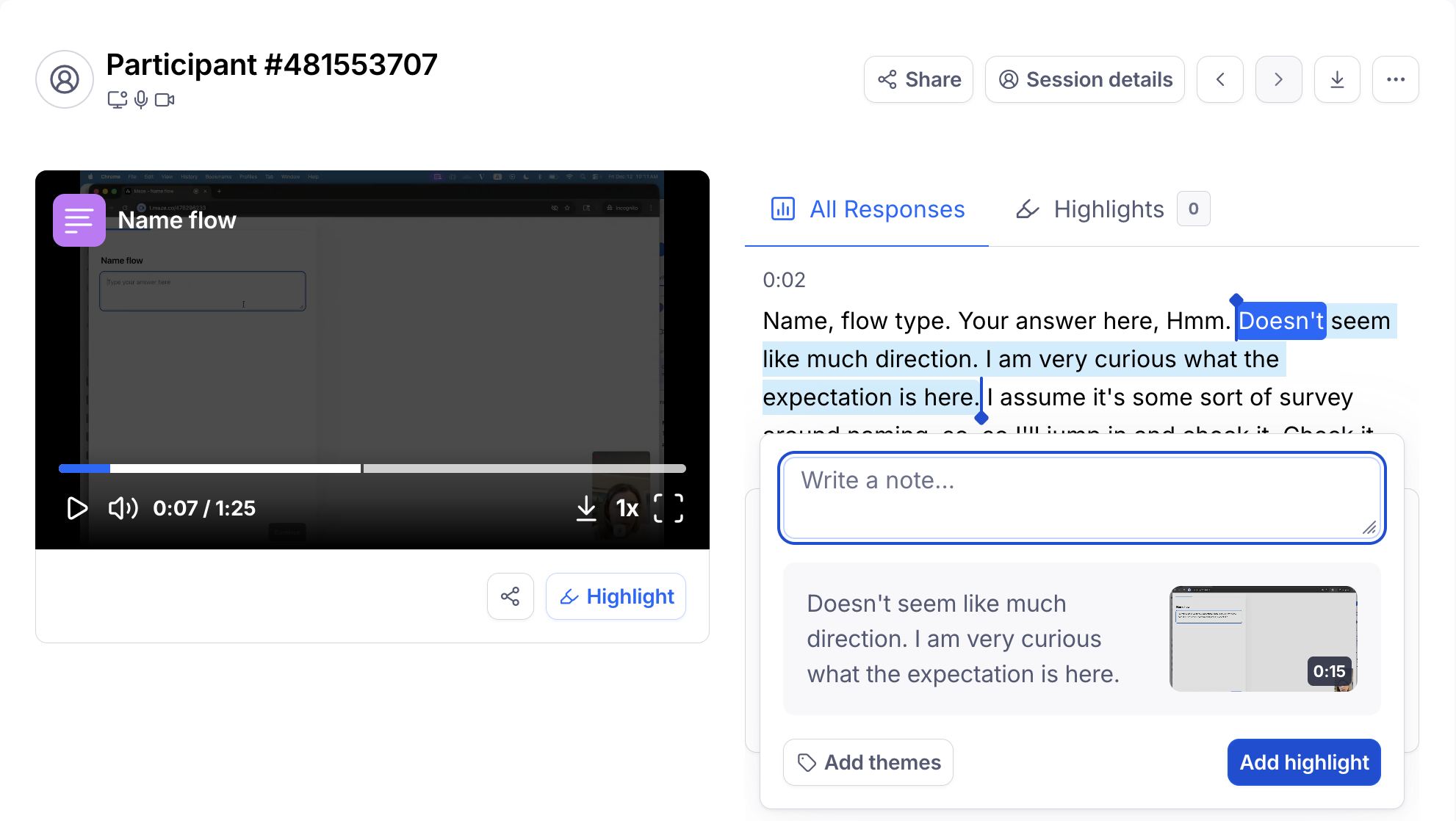 Highlights let you save key quotes and non-verbal reactions (ie: confusion, delight, frustration).