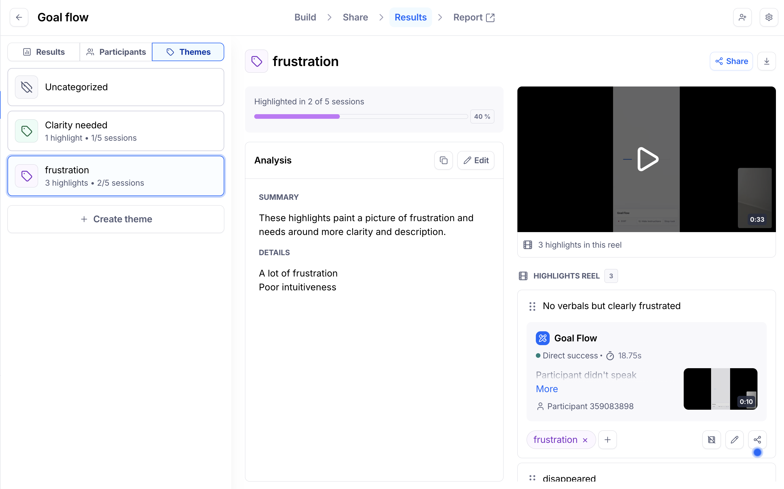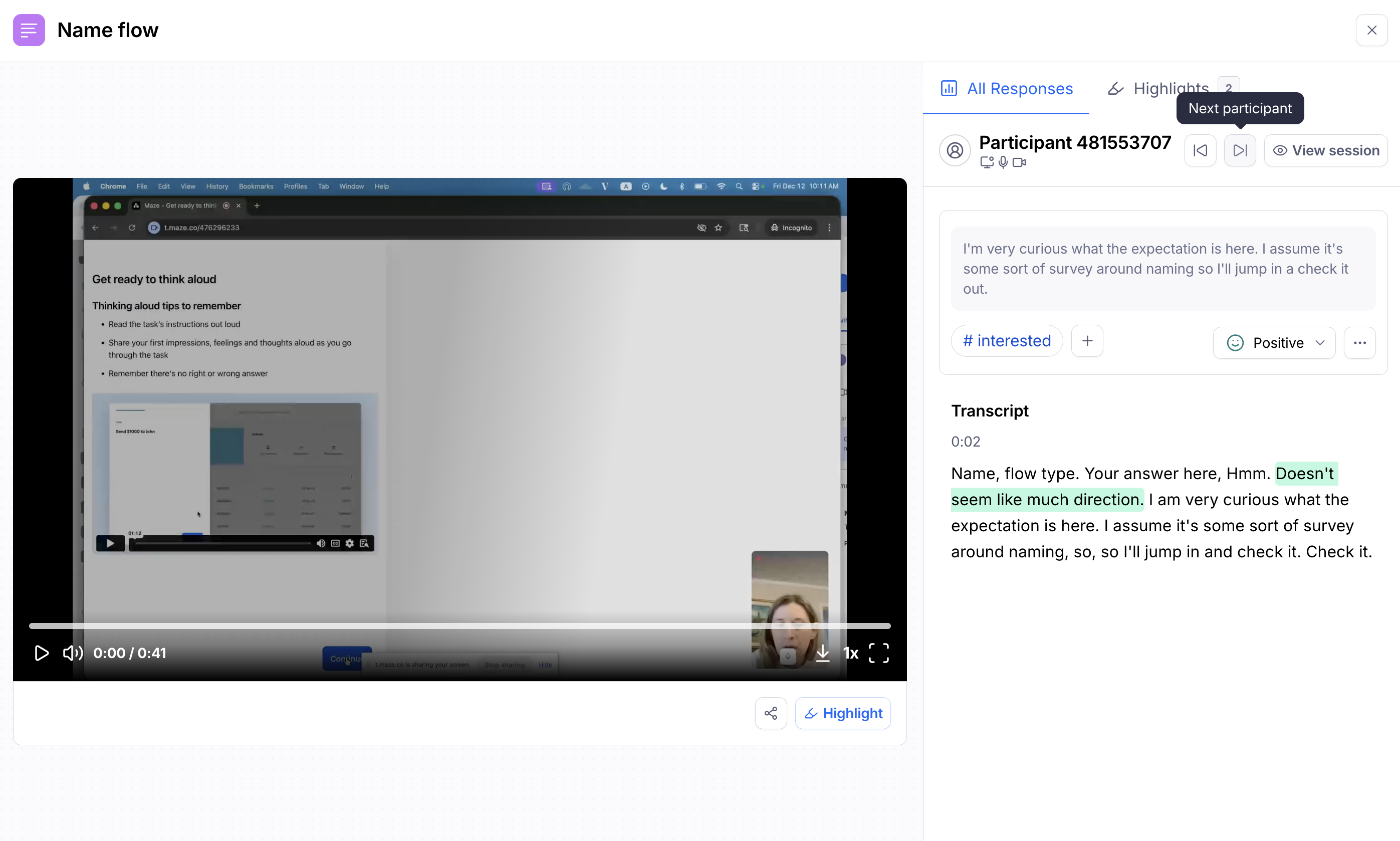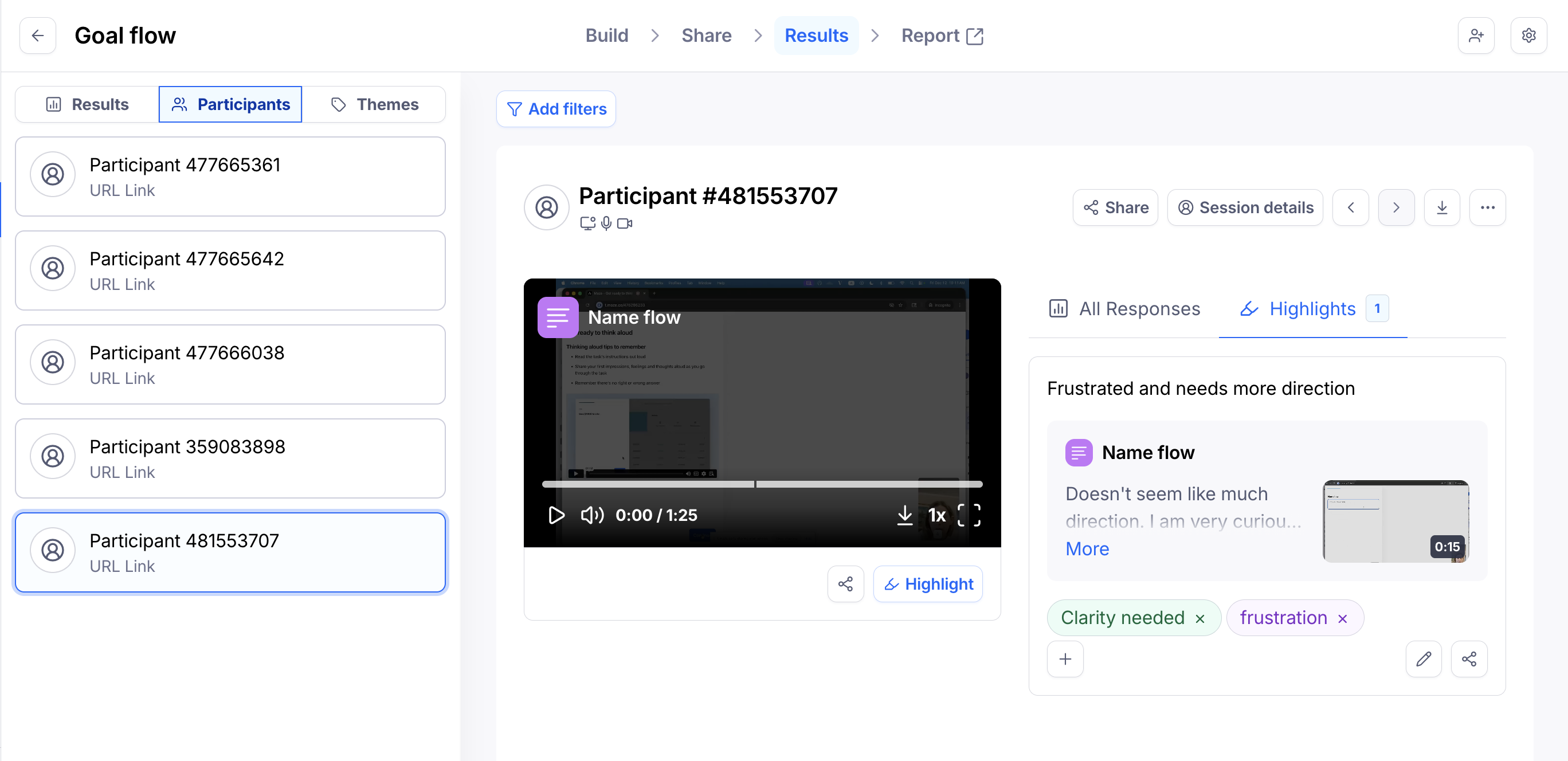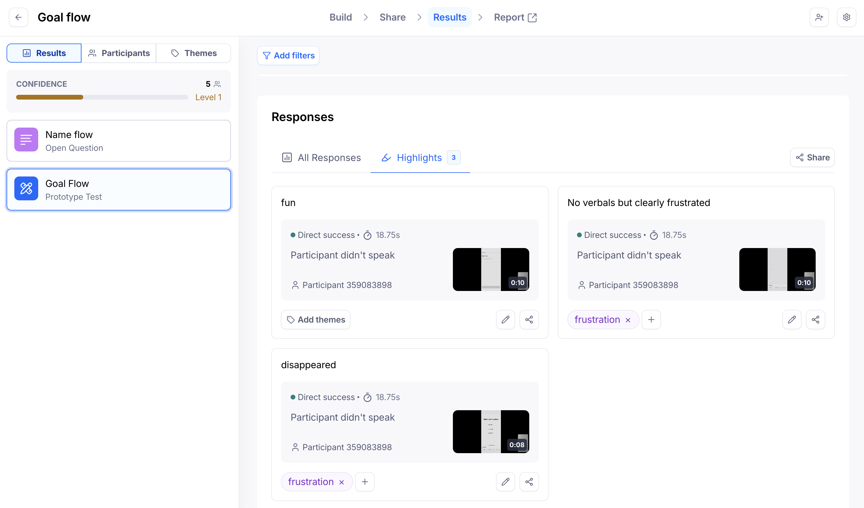 Highlights let you save key quotes and non-verbal reactions (ie: confusion, delight, frustration).