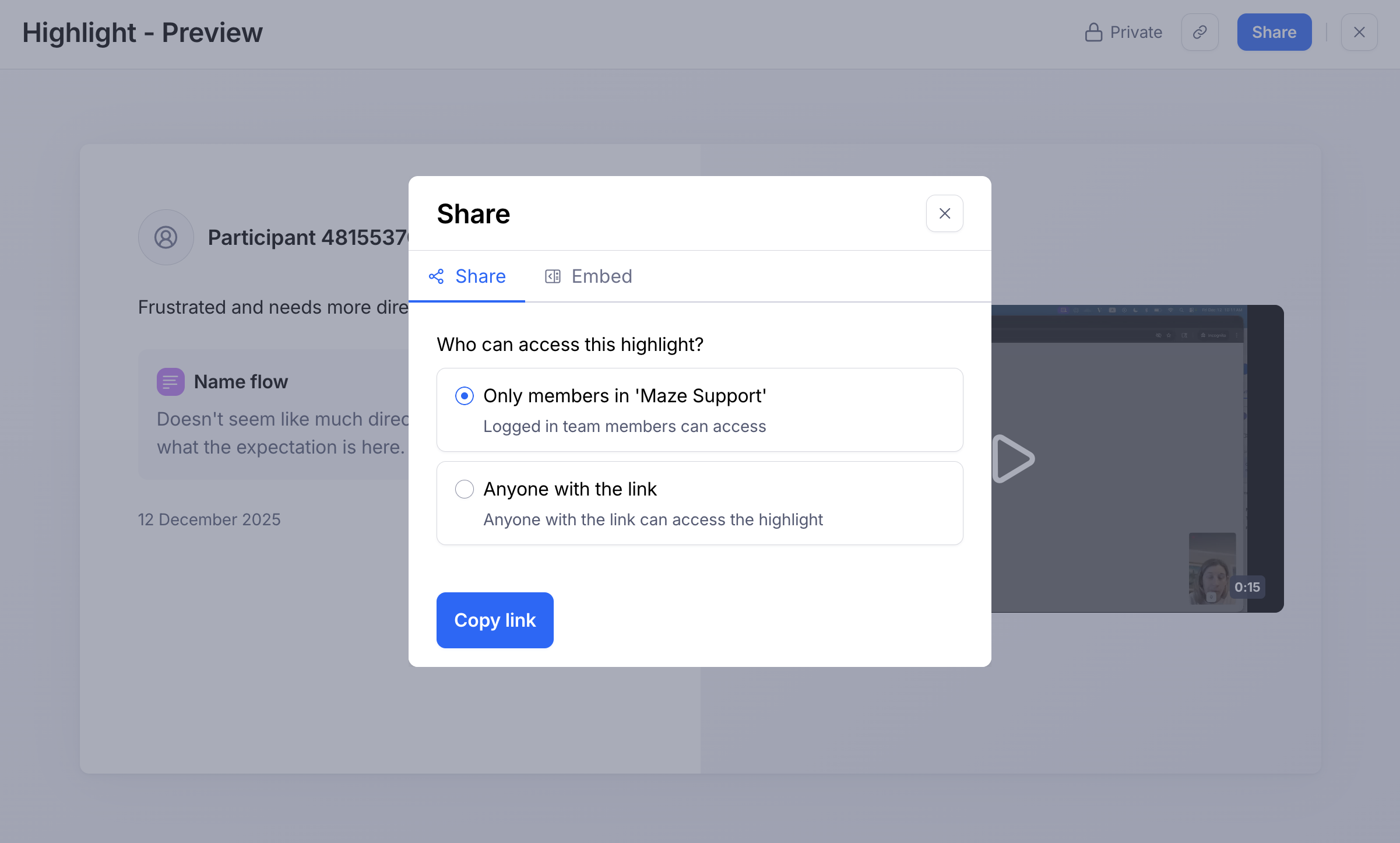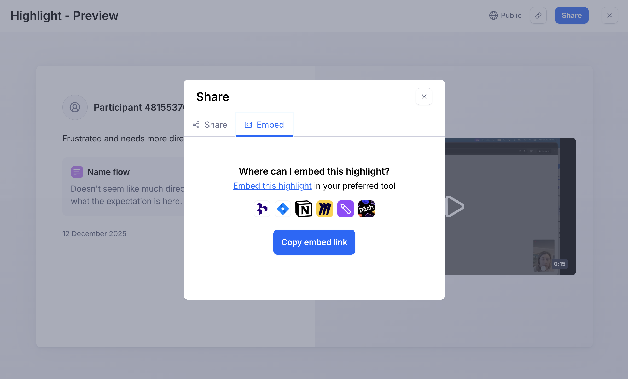 Highlights can be shared via direct link, embedding in other tools, or downloaded as video files. Highlights enable context preservation when sharing since you can watch the clip and see the related block responses alongside it.