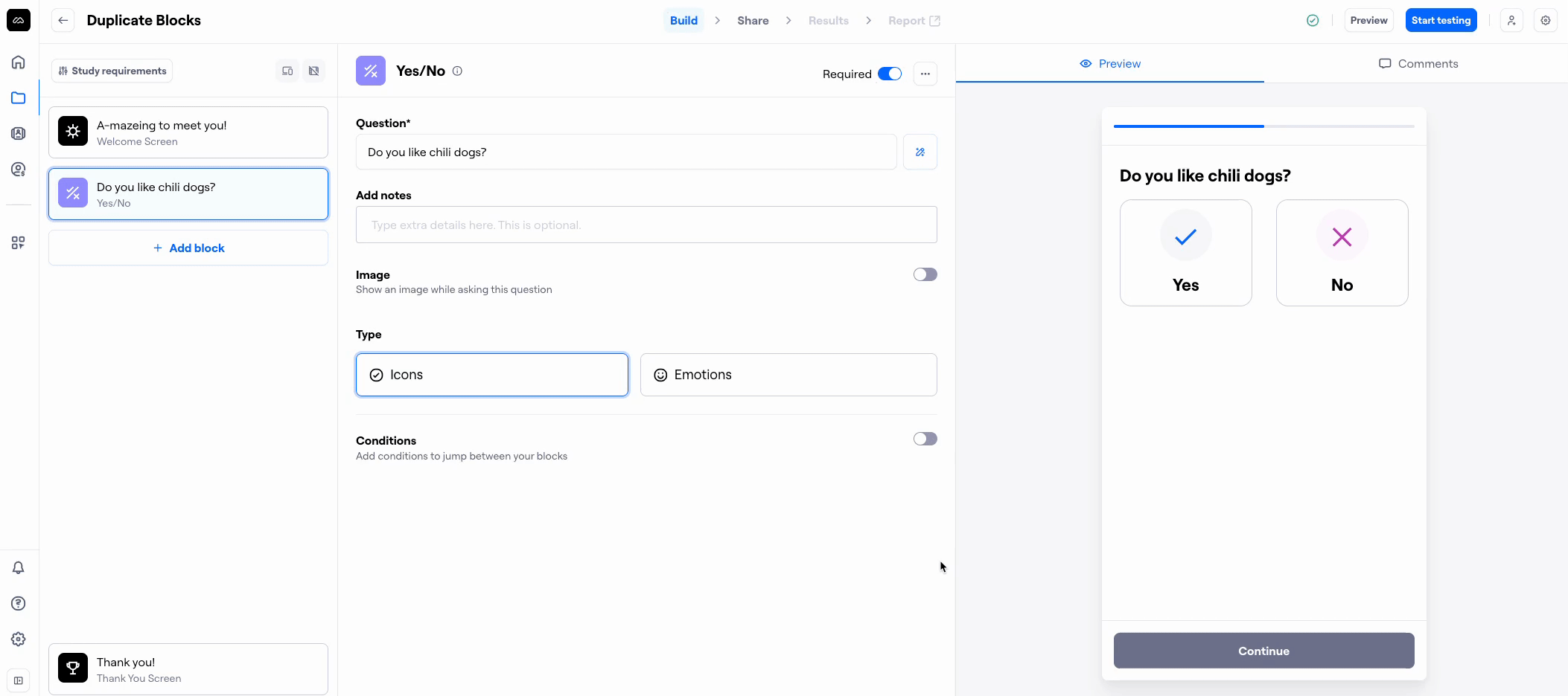 After setting up the first variant in a Variant Comparison block, use the Duplicate button. This will create a copy of that variant and duplicate all blocks within it.