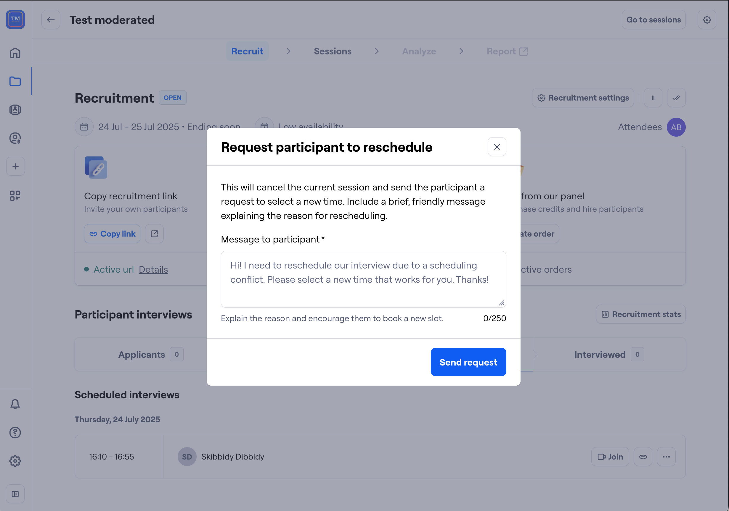 Then click on Request to reschedule, provide a reason for rescheduling, and submit your request. This will send a reschedule request email to the participant and move them back to the Invited status.