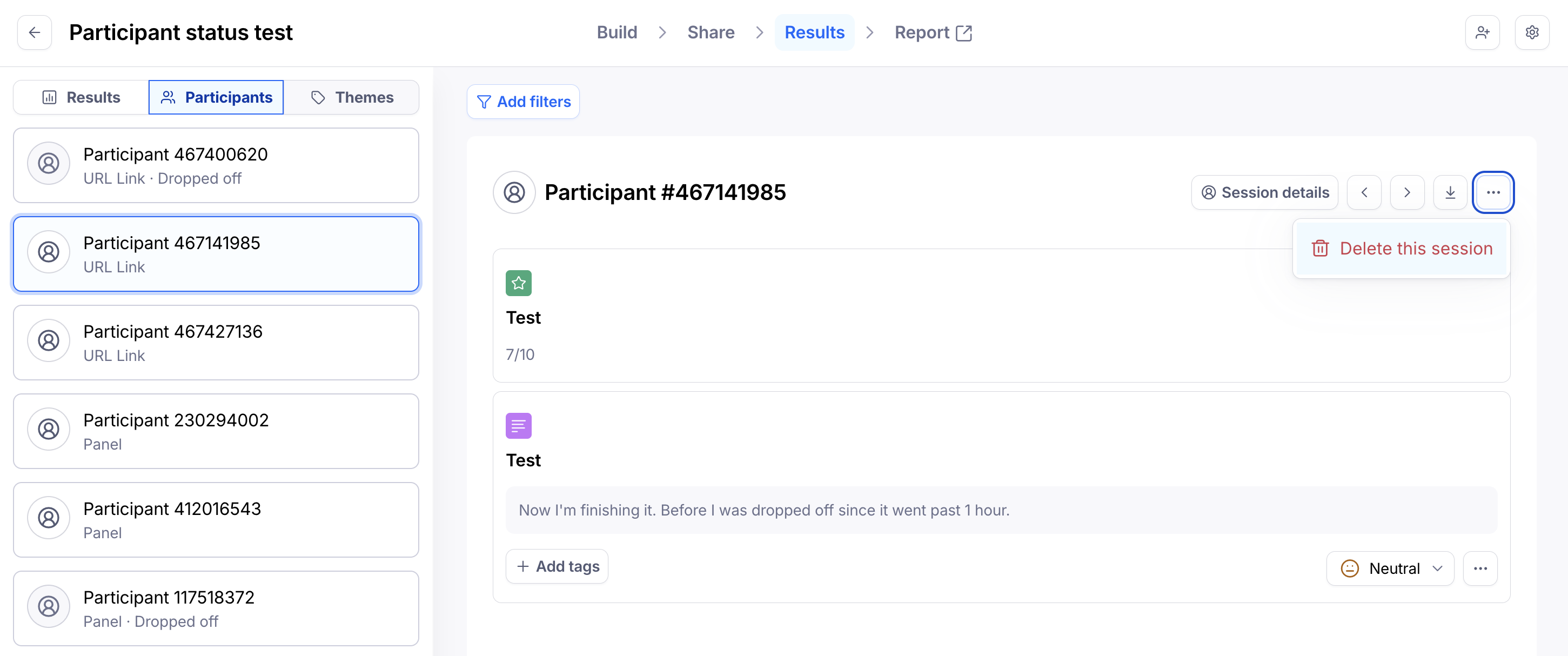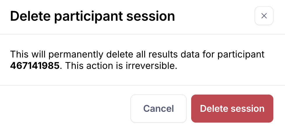 Deleting a test session permanently removes all answers and Clips recordings from an individual participant in a maze.