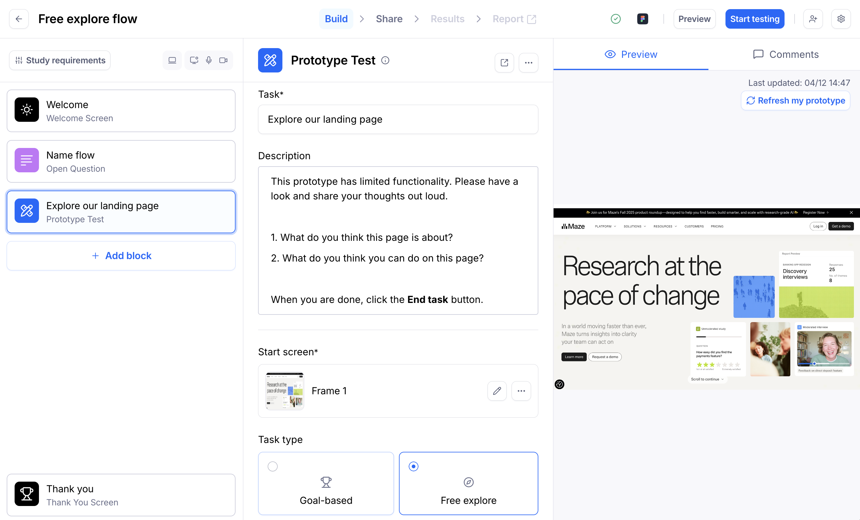 - Optionally, include any follow-up questions you want to ask your testers about the screen they just saw (using, for example, an opinion scale or a question block).