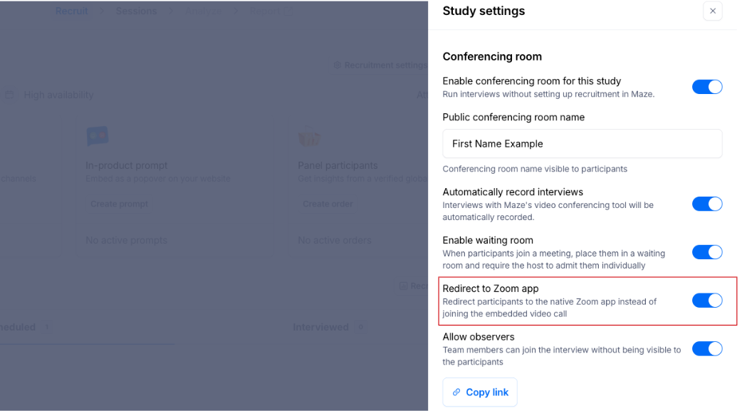 If you select Maze conferencing, you'll notice an allow observers option appears. This feature allows you to discreetly bring stakeholders into live interview sessions without being visible to the participant. Invite an observer to an interview