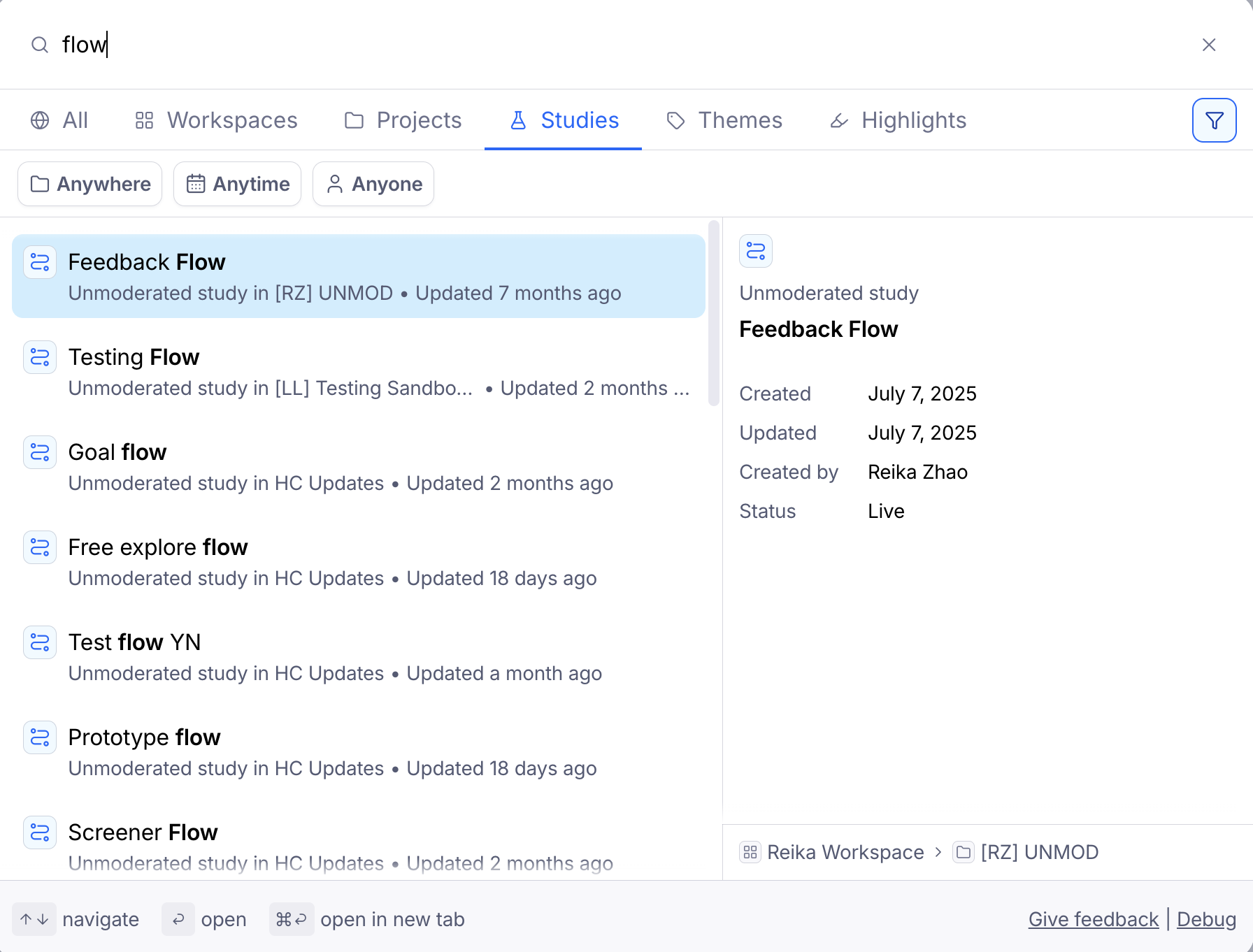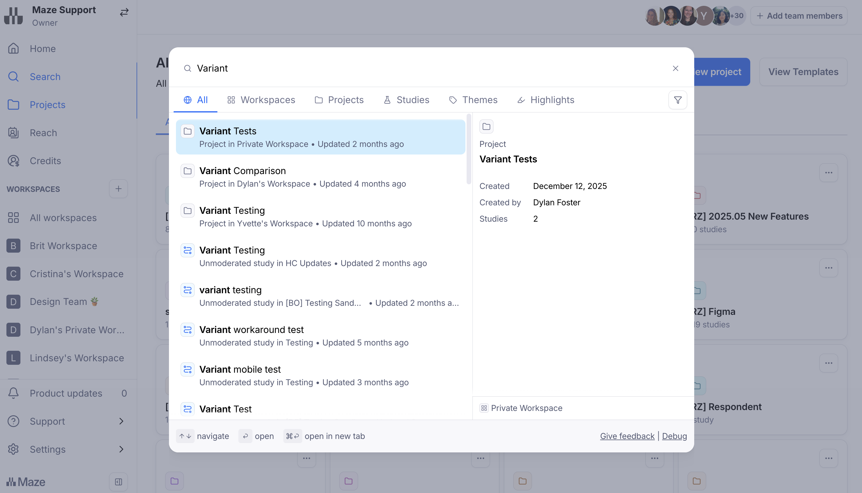 Our global search functionality allows users to search across their entire workspace to find studies, participants, insights and more while saving time, preventing duplication and making your work more discoverable and accessible as you scale your research using Maze.