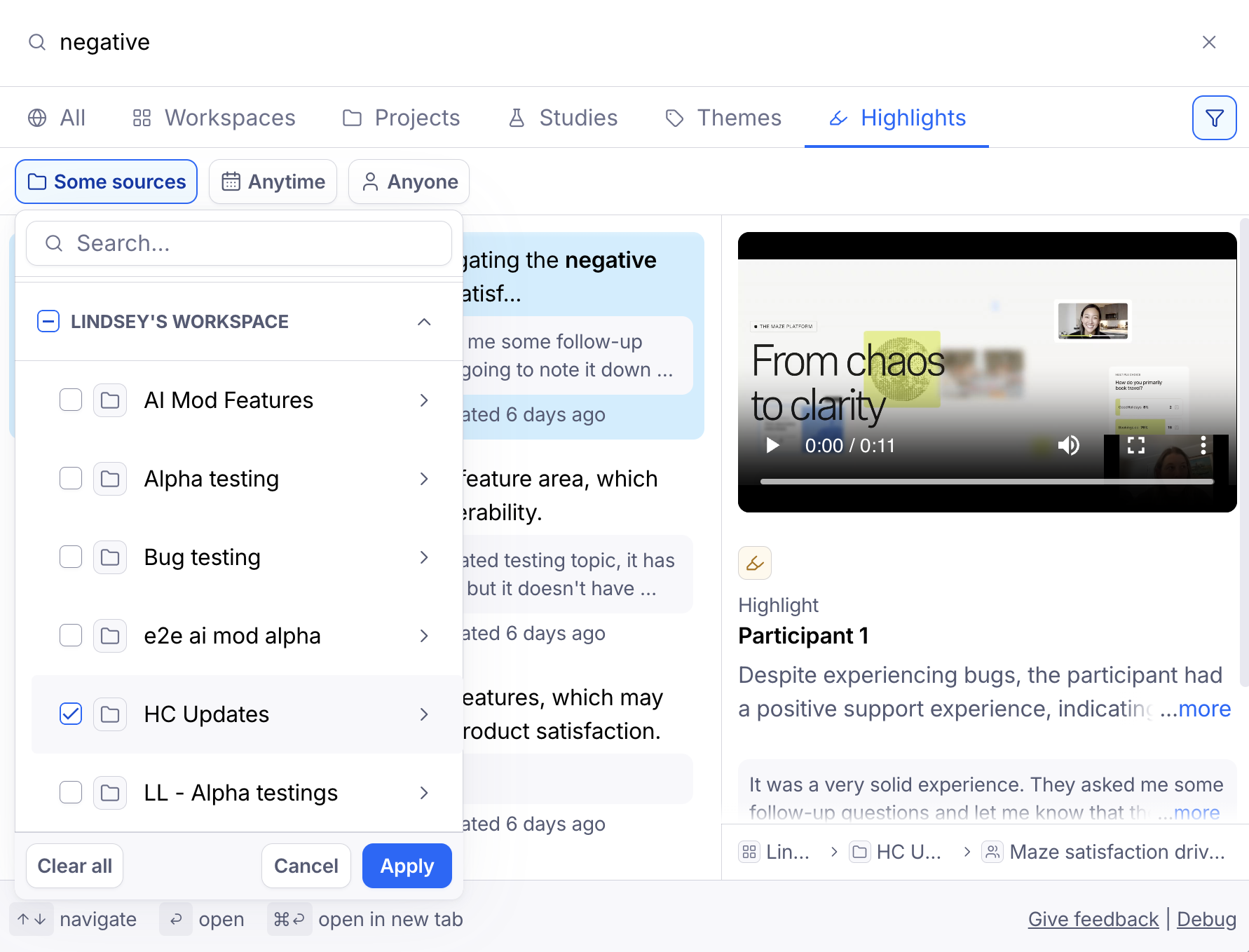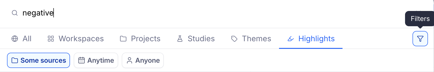 Click Search and enter one or more keywords to start searching for a workspace, project, study, theme, or highlight. You can also click the filter icon (far right) to filter by workspace, project, study, a specific time frame or a specific team member.