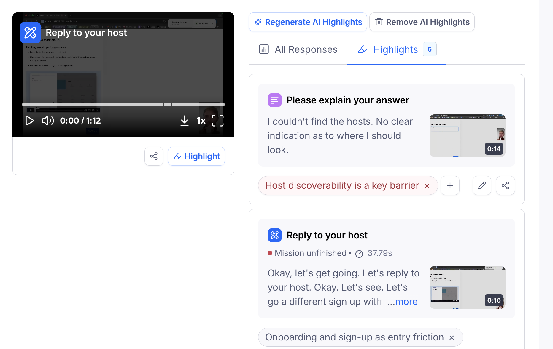 For unmoderated studies, Maze automatically generates highlights from clip transcripts when participant sessions are completed. Each AI-generated highlight includes a note summarizing the key observation from the clip, giving you a head start on analysis without any manual effort.