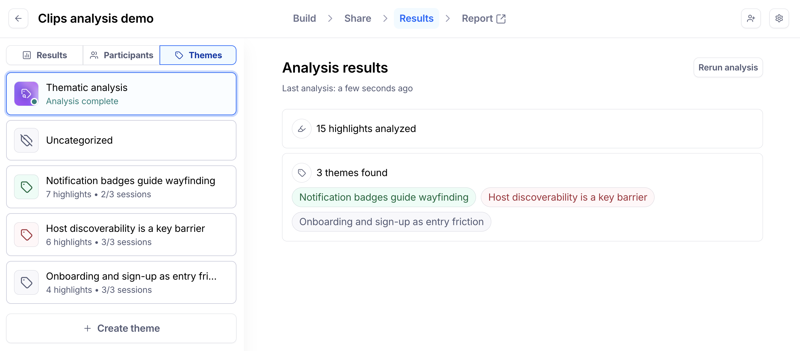 Thematic analysis automatically identifies patterns and insights across all participant sessions within your unmoderated study, transforming individual participant feedback into comprehensive, actionable themes. This powerful feature analyzes your clips to surface key topics, sentiment trends, and findings that help you understand the bigger picture from your research.