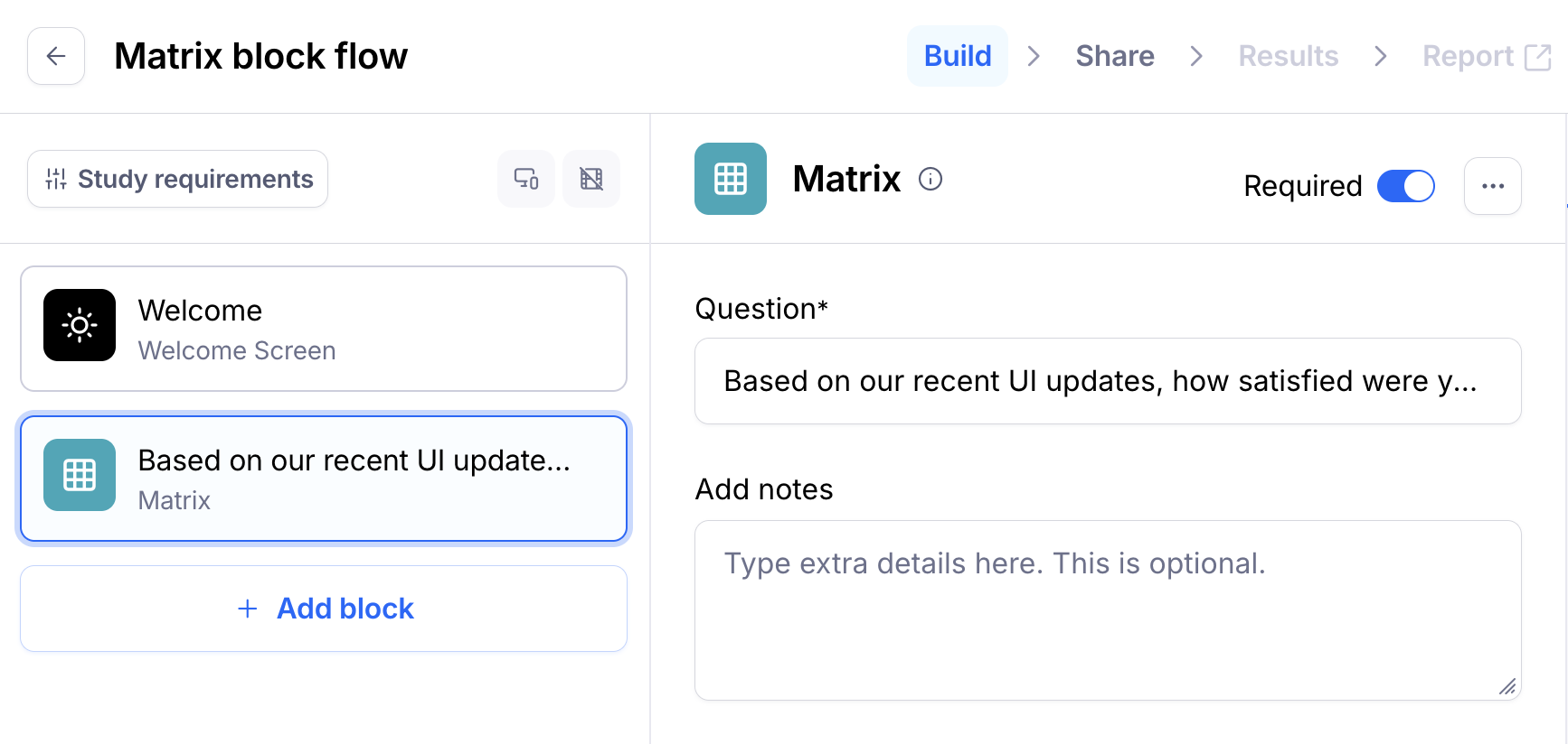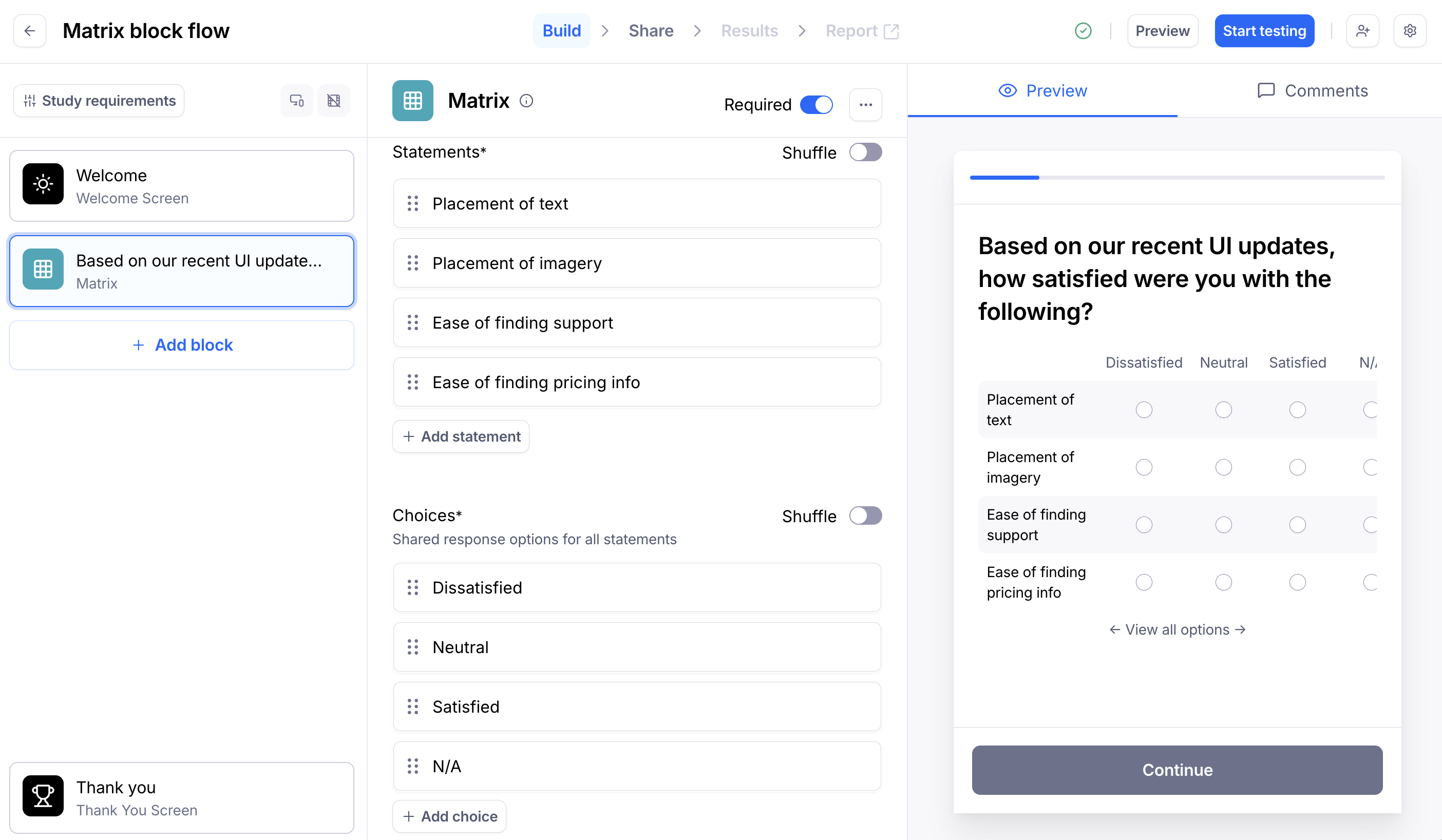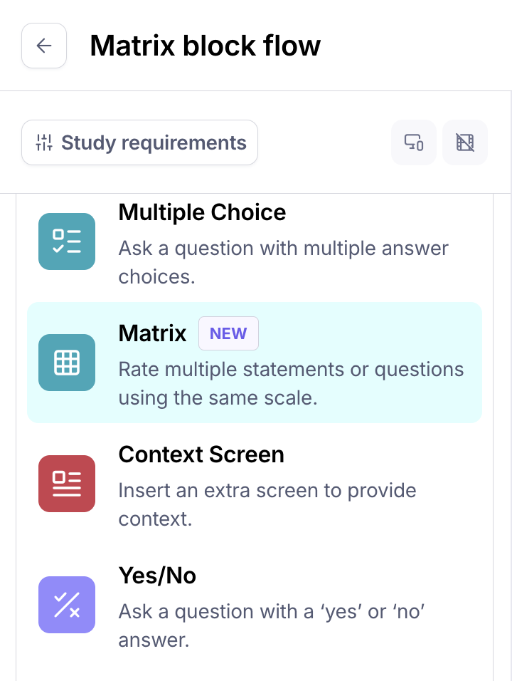 The Matrix block allows you to combine multiple statements (rows) with shared response options (columns), making it easy to gather comparative feedback in a single, organized view. Use it for Likert-scale surveys, feature satisfaction ratings, or any scenario where you want participants to evaluate multiple items using the same criteria.