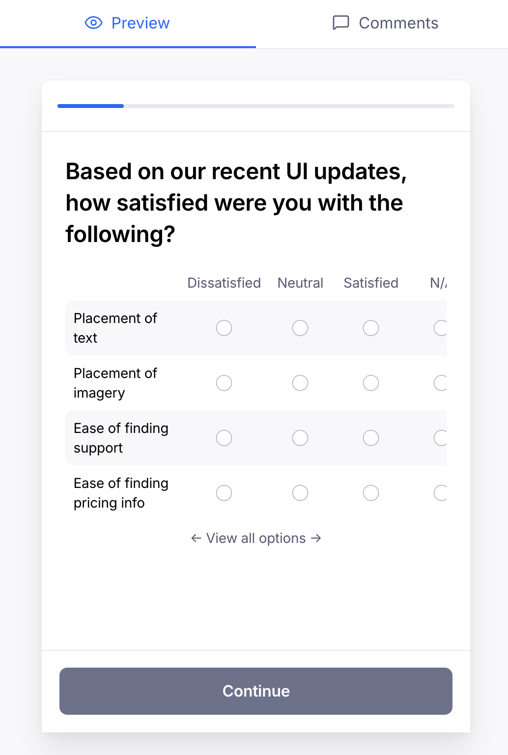 - Feature satisfaction surveys: Rate satisfaction with multiple product features on the same scale