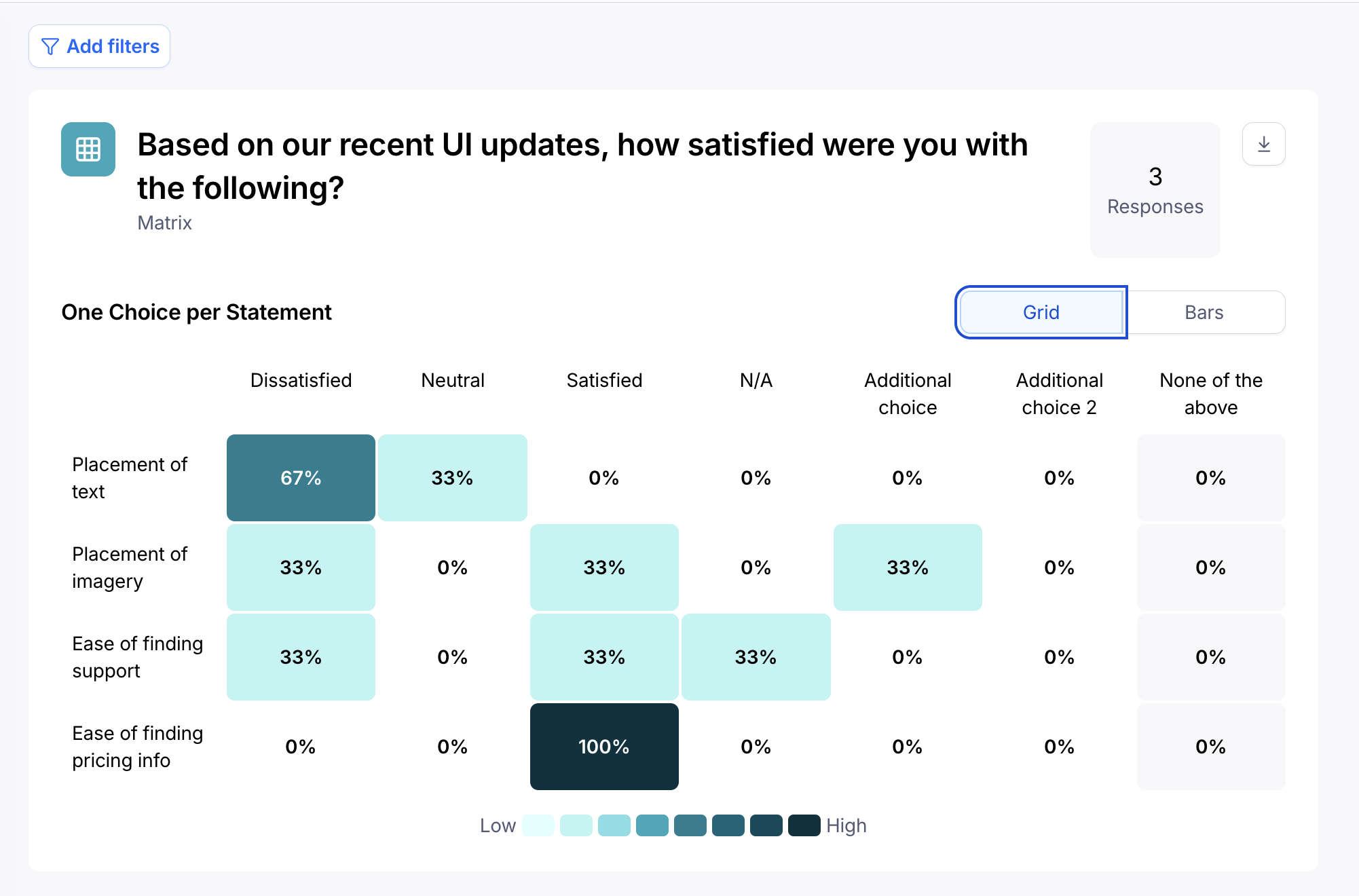 When viewing results for a Matrix block (either by Grid or Bars), you'll see:
