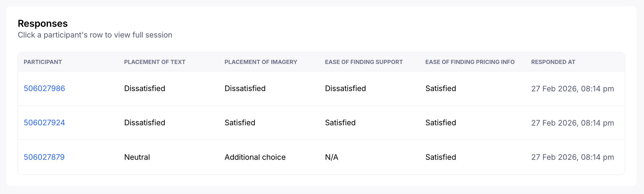 Beneath the matrix, you can view individual responses of your participants as well as the date and time of their response.