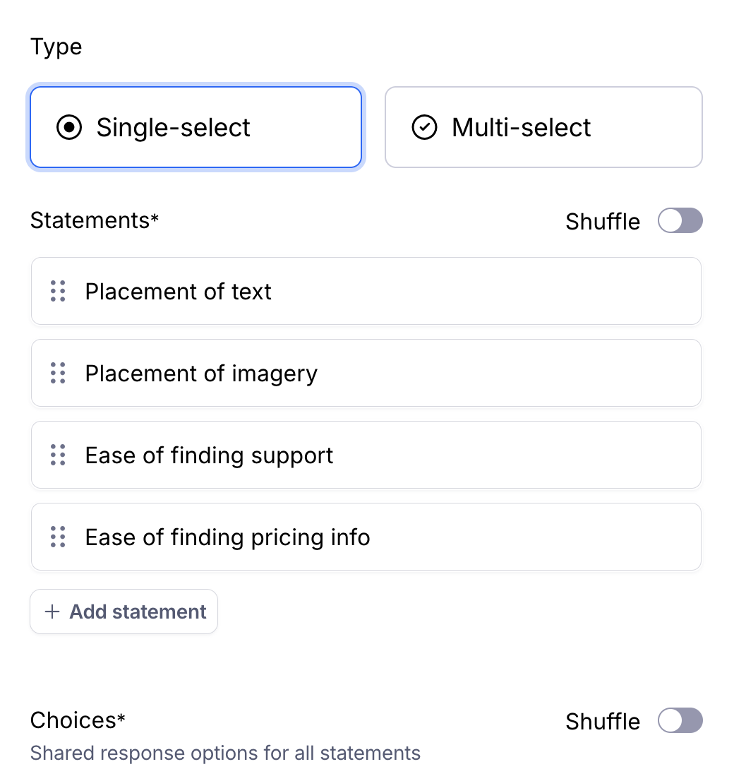 - Single-select (default): Participants choose one option per row—ideal for rating scales