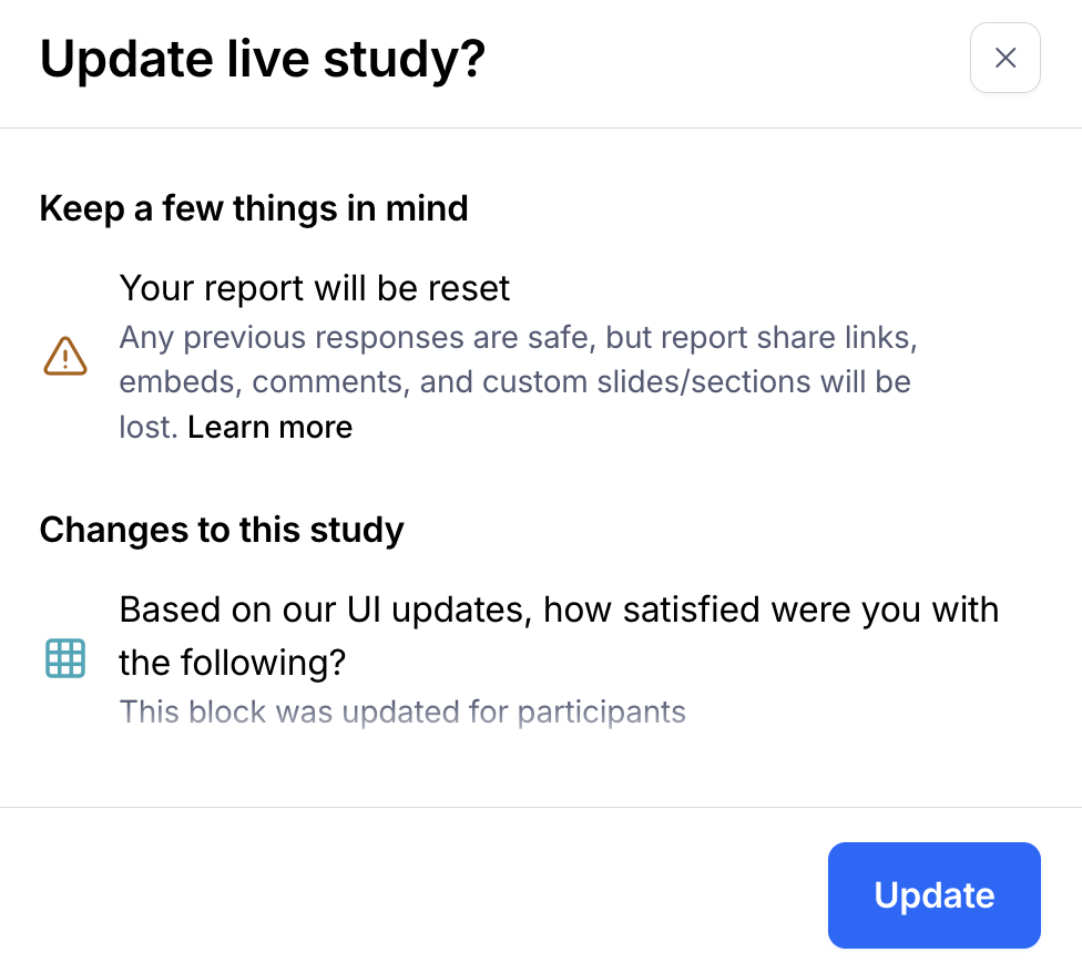 - You’ll see a modal listing all the changes you've made. If everything looks good, click Update to confirm the changes to the live study. This action is irreversible. Version control isn’t currently available in Maze.
